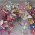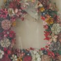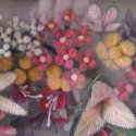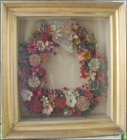beautiful vintage (estimated 1940) molla flower wreath in a shadow box frame.